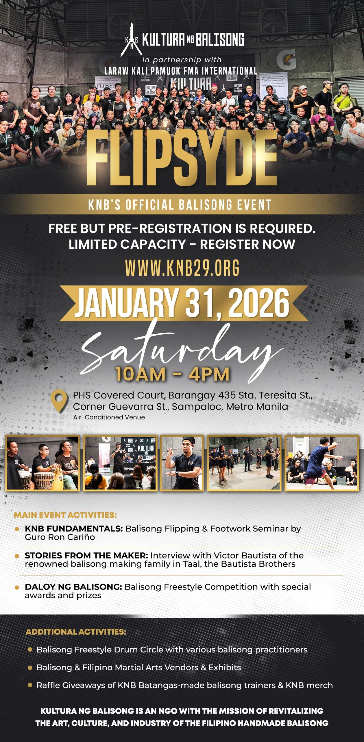We’ll be teaching KNB balisong flipping fundamentals and footwork, Daloy Ng Balisong contest, and raffle giveaways including new KNB merch and Batangas-made balisong trainers.